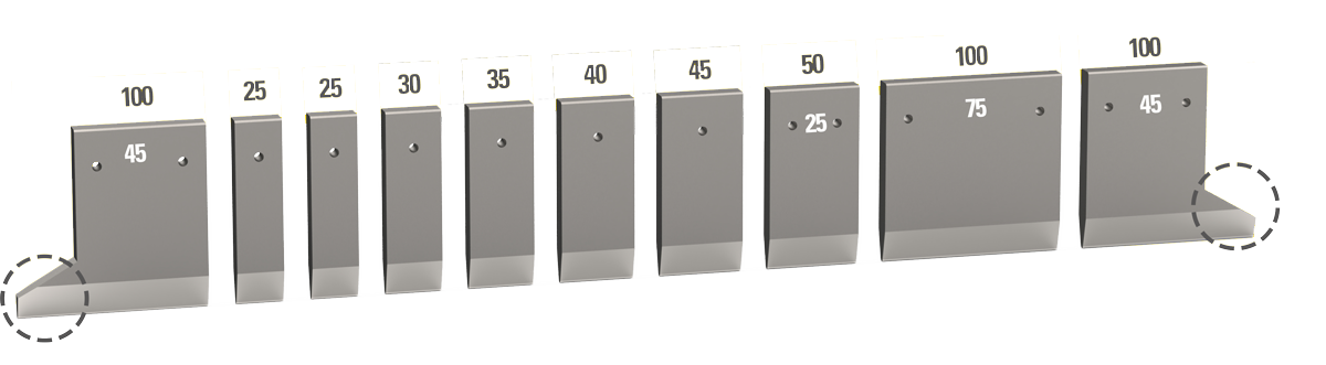✔ Держатели для лезвий: 100 (левый рог) 25, 25, 30, 35, 40, 45, 50, 100, 100 (правый рог) = 550 мм(набор)